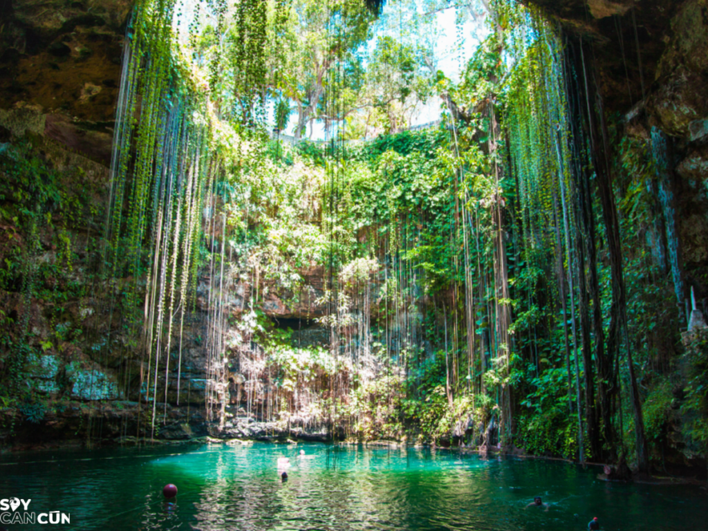 ● Ik Kil: Um cenote de águas azul-turquesa cercado por uma exuberante vegetação.